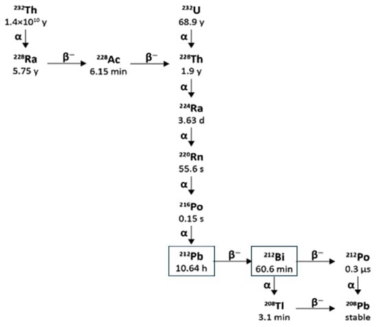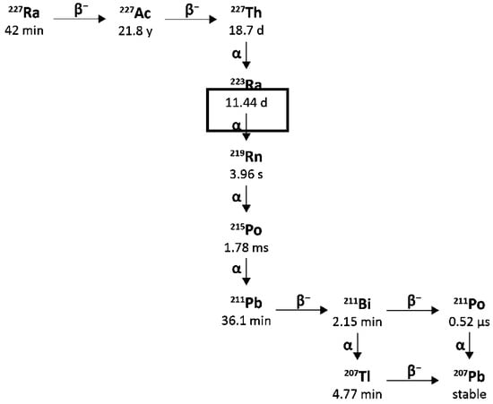 Actinium is a radioactive component with atomic number 89 [11]. Only two of its 32 isotopes, Actinium-228 and Actinium-227 are naturally produced by the disintegration of Thorium-232 and Uranium-235, respectively [11,12]. With its long half-life of 21.7 years and predominant β-emission decay, Actinium-227 represents the most common actinium isotope. However, Actinium-228, a β-emitter, is highly uncommon [11,12].