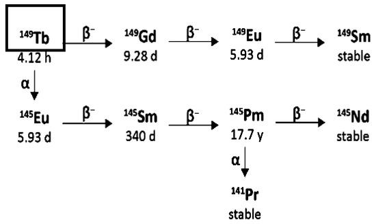 Actinium-225 is considered a “nanogenerator” since one decay of this element produces four α, three β particles, and two γ emissions [17]. The α particle emissions and the rapid disintegration of Actinium-225 make it an appealing choice for targeted radionuclide therapy (TAT) [17,19]. However, it is essential to consider the notable Actinium-225 cytotoxicity due to its extended half-life and the various α particles produced throughout its decay chain [14].