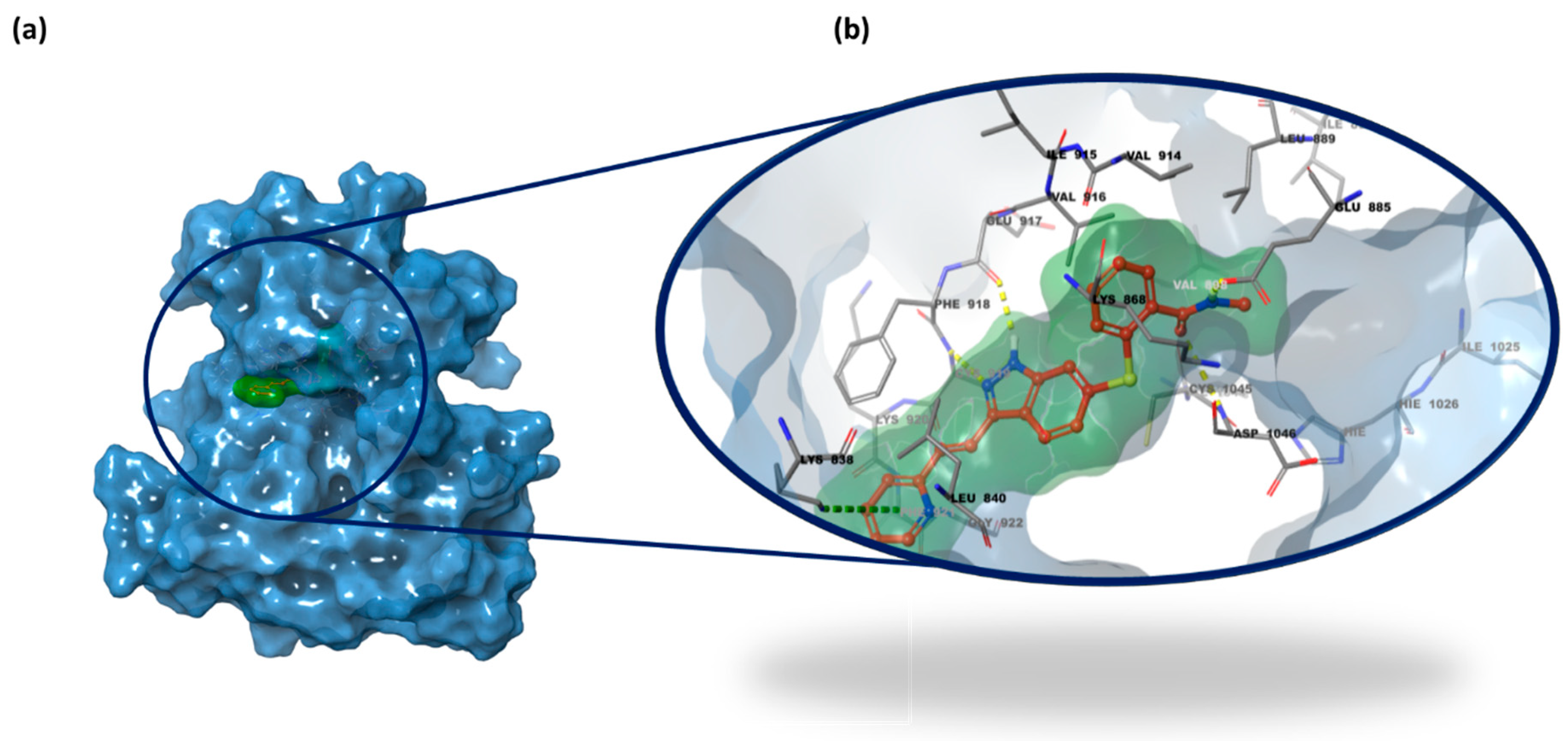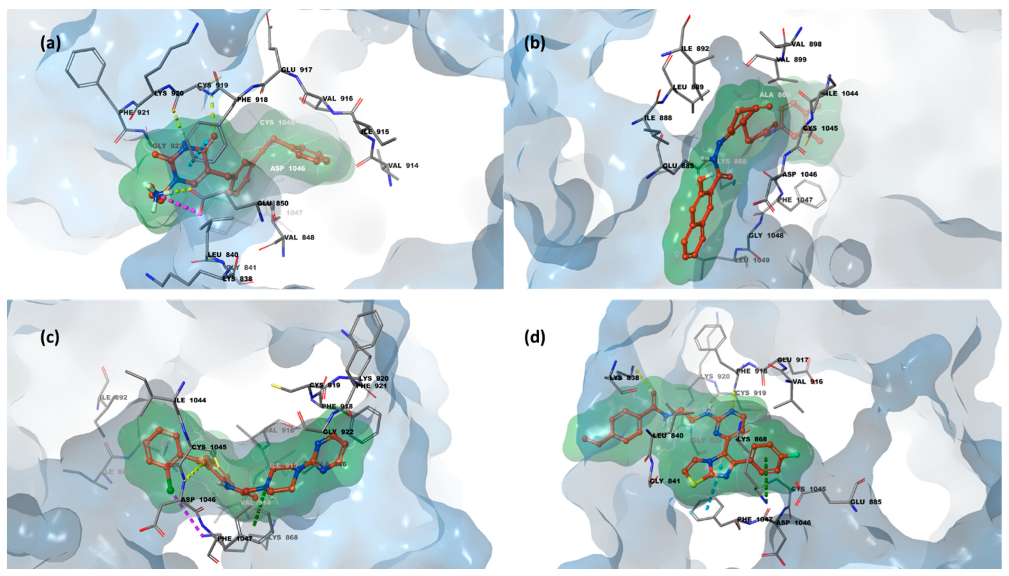 - Modi, S.J.; Kulkarni, V.M. Exploration of structural requirements for the inhibition of VEGFR-2 tyrosine kinase: Binding site analysis of type II, ‘DFG-out’ inhibitors. J. Biomol. Struct. Dyn. 2022, 40, 5712–5727. [Google Scholar] [CrossRef]