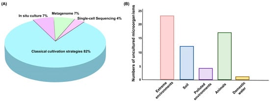 Research strategies and sources of uncultured microorganisms. (A) Proportion of strategies used to study uncultured microorganisms. (B) Sources of uncultured microorganisms.