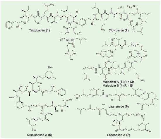 Teixobactin (1) is a depsipeptide antibiotic discovered from Eleftheria terrae, an uncultured Gram-negative β-proteobacterium that was identified from a soil sample using the iChip technology [31]. The chemical structure of teixobactin features a distinctive scaffold composed of enduracididine, methylphenylalanine, and four D-amino acids (Figure 3). These unique components contribute to the antibiotic’s structural divergence from existing antibiotics and its potent antibacterial activity, enhancing its potential as a promising therapeutic agent, especially in the context of antibiotic-resistant infections. Teixobactin is highly effective against a broad range of pathogenic microorganisms including drug-resistant Staphylococcus aureus, Streptococcus pneumoniae, Enterococci, M. tuberculosis, Clostridium difficile and Bacillus anthracis. Potent in vivo efficacy was also observed in mice models of infection with S. aureus and S. pneumoniae [98]. Mechanism of action studies suggest that teixobactin separately targets lipid II (peptidoglycan) and lipid III (teichoic acid), which are essential precursors of bacterial cell wall biosynthesis. This binding specificity accounts for teixobactin’s potent efficacy against Gram-positive strains, while also explaining its limited activity against most Gram-negative bacteria [99,100]. The further design and synthesis of teixobactin analogs are currently under development. With continued advancements, these analogs hold the potential to become valuable tools in the fight against antibiotic-resistant pathogens, offering promising new therapeutic options for the future [101].