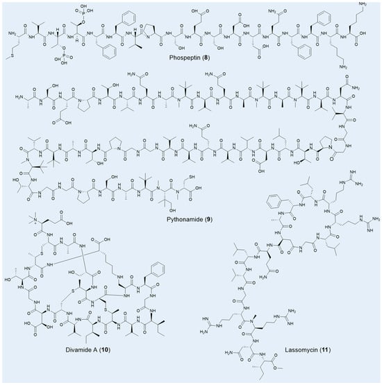 Lassomycin (11), a unique lasso peptide featuring a macrolactam ring and a C-terminal esterification (Figure 4), was uncovered from the previously uncultured soil bacterium Lentzea kentuckyensis sp. using a bioactivity-guided screening approach [43]. This peptide demonstrates exceptional bactericidal activity, specifically targeting M. tuberculosis, with a MIC of 0.8–3 μg/mL, and exhibits low cytotoxicity. Impressively, lassomycin remains effective against dormant-phase mycobacteria and drug-resistant strains, where even the leading bactericidal agent rifampicin often falls short. Lassomycin’s bactericidal effect is achieved by activating the ATPase ClpC1 without promoting ATP-dependent protein degradation, a mechanism distinct from those previously reported. Interestingly, the total chemical synthesis of lassomycin resulted in a complete loss of bioactivity against M. tuberculosis, underscoring the critical role of its natural, unthreaded structure in maintaining its potency [114].