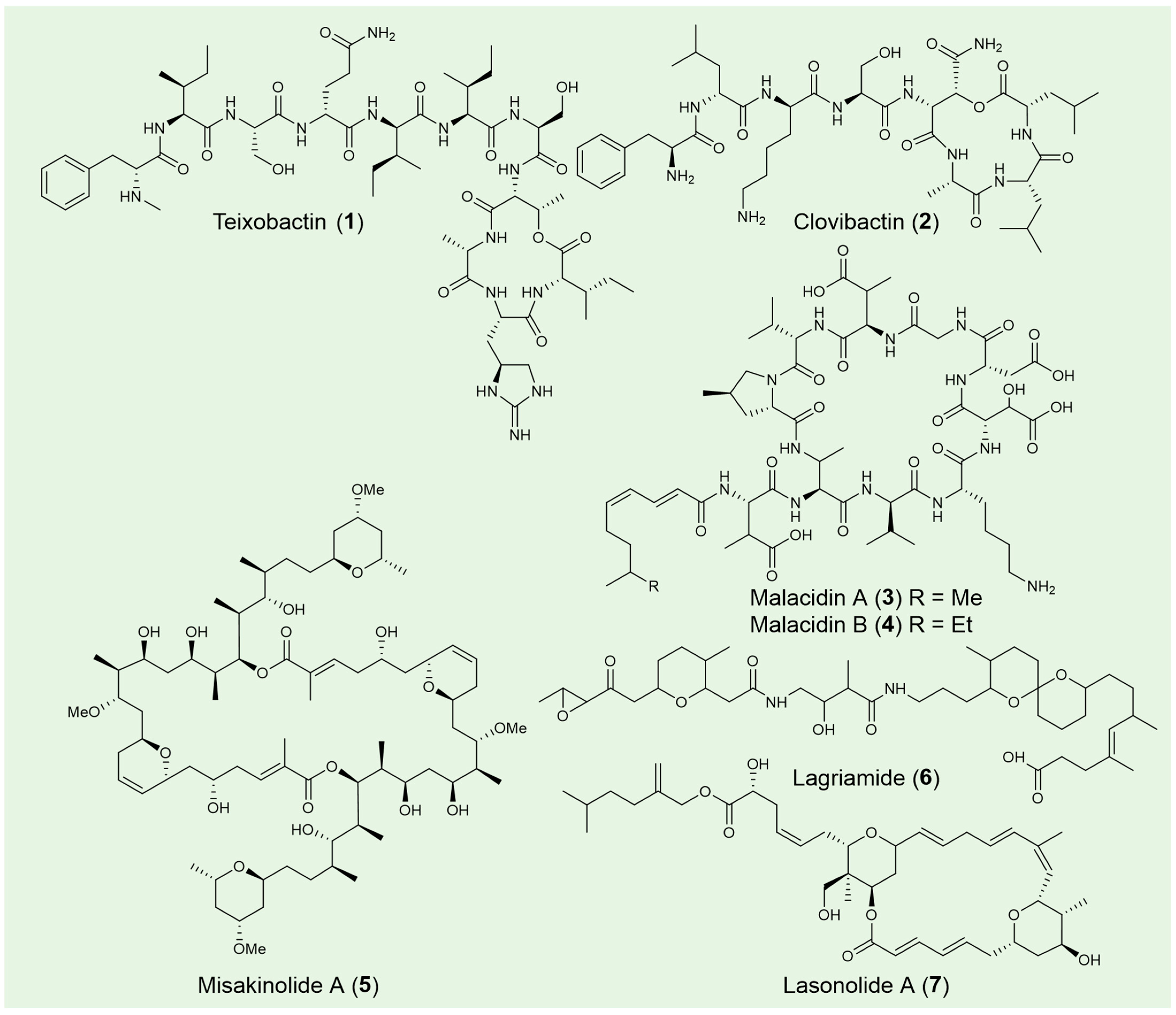 Teixobactin (1) | C58H95N15O15 | NRPS | Eleftheria terrae | Soil | In situ culture | [31] |