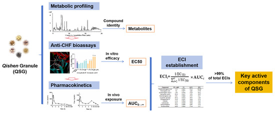 In this study, an efficacy- and in vivo exposure-oriented integrated method was first developed and utilized for the investigation of the effective components of QSG. Figure 1 shows the experimental flow chart of this study. The ECI for each component was calculated by introducing the bioeffect weight coefficient of median effective concentration (EC50) with in vivo exposure; thus, those with both effectiveness and higher exposure levels could be recognized as the effective components of QSG. The results of this study could be helpful for the clarification of the effective substances of QSG, and the identified key active components could also establish a basis for enhancing the quality control of QSG in clinical practice. The efficacy- and in vivo exposure-oriented integrated method for the investigation of effective components could provide reliable references for other TCMs.
