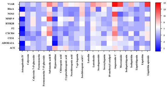 Heatmap of molecular docking results for 24 components with 10 core targets.