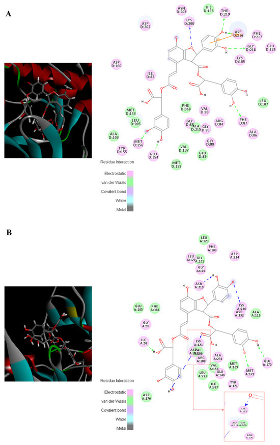 Visualization of the binding of salvianolic acid B with ROCK1 and ROCK2. (A) ROCK1; (B) ROCK 2.
