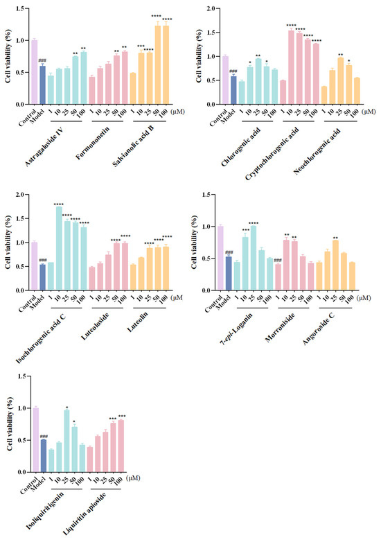 When evaluating the cytotoxicities of the absorbed compounds, the H9c2 cells were seeded in 96-well plates at a density of 1 × 104 cells/well; when cells reached 80% confluence, they were treated with 25 and 50 μM of the 24 analytes to screen the non-toxic concentration ranges. Afterward, the protective effects were verified by assessing the cell viability when treating with different concentrations (1, 10, 25, 50, and 100 μM) of the analytes prior to OGD/R treatment.