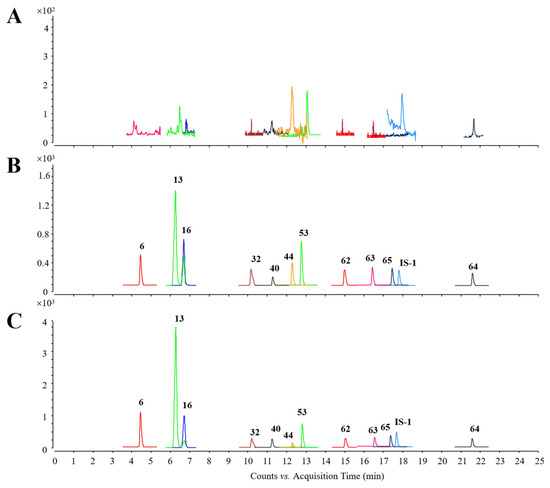An Agilent 6470 QQQ mass spectrometer (Agilent Technologies, Santa Clara, CA, USA) via an electrospray ionization (ESI) interface was employed for analyte determination, with dynamic MRM mode in negative mode utilized. Ion source parameters were set as follows: temperatures of drying gas and sheath gas were 300 °C and 300 °C, flow rates of drying gas and sheath gas were 7 L/min and 11 L/min, the nebulizer was set at 35 psig, capillary voltage was 3500 V (−), and nozzle voltage was 2000 V (−). As for the HPLC domain, an Agilent 1260 Infinity HPLC system was utilized. Chromatographic separations were conducted on a ZORBAX Eclipse Plus C18 column (3.0 × 50 mm, 1.8 μm, Agilent Technologies, California, USA). The mobile phase was composed of 0.1% aqueous FA (A, (v/v)) and 0.1% formic acid methanol (B), the flow rate was set at 0.5 mL/min, and the column oven was maintained at 40 °C. The gradient elution was programmed as follows: 0–5 min, 5–25% B; 5–15 min, 25–55% B; 15–20 min, 55–85% B; 20–22 min, 85–95% B; and 22–25 min, 95% B. The injection volume was set at 10 μL.