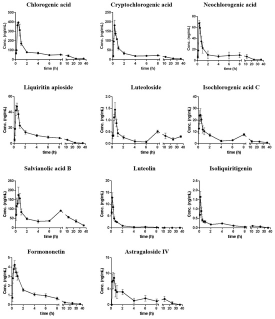 It was observed that 11 compounds could be detected in plasma within 5 min, and most compounds reach their Cmax within 40 min, which indicated that these compounds could be rapidly absorbed into the circulation system. In addition, the mean residence time (MRT) of each analyte ranged from 1.839 to 16.01 h, with most compounds retained for more than 5 h. Among them, the MRTs of luteoloside and salvianolic acid B were more than 10 h, indicating that they were retained in the circulation system for a relatively long time; however, most compounds could be eliminated within 36 h. Double peaks were observed for luteoloside, isoliquiritigenin, isochlorogenic acid C, salvianolic acid B, and astragaloside IV. They reached the first peak at 10–30 min, and then reached the second peak at 4–12 h, with the concentrations of their second peak lower than those of the first peak, which might be attributed to the hepatic and intestinal circulations. In addition, the second peak for compounds like isoliquiritigenin might also be due to the glycolysis of liquiritin apioside, liquiritin, and isoliquiritin existing in QSG [36].