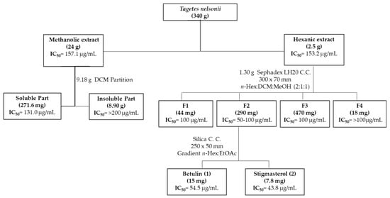 The methanolic extract of Tagetes nelsonii was partitioned using dichloromethane (CH2Cl2), yielding a non-polar fraction that exhibited anti-T. vaginalis activity, suggesting that the active compounds were of low polarity. Subsequent fractionation of the hexanic extract by Sephadex column chromatography yielded fraction 2 with the best anti-trichomonal activity. Further purification of this active fraction by silica gel column chromatography led to the isolation of two known compounds, betulin (1) and stigmasterol (2), obtained as white powders, Figure 1.