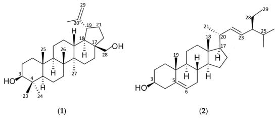 Molecular structure of triterpenoids isolated from Tagetes nelsonii: (1) betulin; (2) stigmasterol.