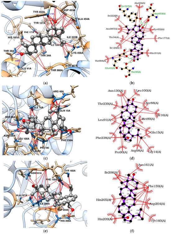 Molecular docking of stigmasterol with T. vaginalis proteins: (a,b) TvpFOR; (c,d) TvLDH; (e,f) TvPNP.