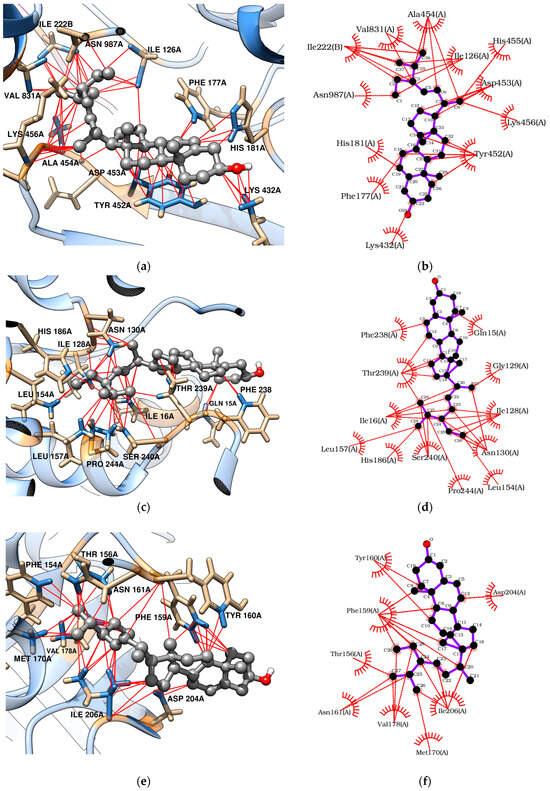 Target protein structures were cleaned by removing ligands, ions, and water before docking. The docking grid was defined based on the coordinates of the co-complexed ligands or active site residues. Docking conformations were ranked according to their binding energy scores and the best docking poses were chosen based on the lowest binding energy and an RMSD cutoff of 2.0 Å. Protein–ligand interactions were visualized and analyzed using LigPlot+ v.2.3.1 software [101].