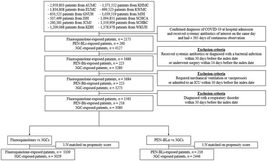 This multicenter, retrospective cohort study included adult patients (≥18 years) hospitalized with COVID-19 from 1 January 2020 to 31 May 2025. Eligible patients had a confirmed COVID-19 diagnosis and received the systemic antibiotics of interest on the same day as hospital admission or emergency department presentation. The date of concurrent COVID-19 diagnosis, hospitalization, and antibiotic therapy was defined as the index date (