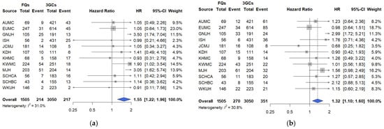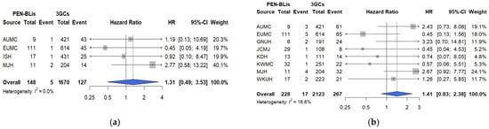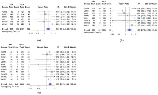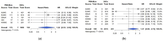 Supplementary Figures S1A,B–S9A,B, S10A, S11A and S12A,B). Qualitative variations in effect estimates were observed across hospitals, likely reflecting differences in size, resistance patterns, and treatment protocols. However, to address this heterogeneity, data from several hospitals were included and meta-analyzed using hospital-specific estimates pooled across 12 tertiary or regional hub centers. Empirical antibiotic class distributions were broadly similar across hospitals, reducing concern that practice differences alone influenced the pooled effect. At 80% power, the comparisons for PEN–BLis were limited, with minimum detectable HRs ranging from approximately 1.75 to 2.44, indicating that null findings cannot exclude smaller, clinically relevant effects. Bacterial coinfections at admission may have been present among some included patients. To reduce baseline misclassification and capture patients hospitalized primarily for COVID-19, individuals with systemic antibiotic use, bacterial infection, or respiratory disorders within 30 days before cohort entry were excluded, and standardized coinfection screens were applied using positive bacterial cultures within 48–72 h of admission and biomarker thresholds, including procalcitonin ≥ 2 ng/mL. Despite these measures, ascertainment may remain incomplete owing to variation in testing intensity and data availability across sites, allowing for potential residual misclassification; however, sensitivity analyses with these stricter exclusions yielded effect estimates consistent in direction with the primary results. Although we attempted to include macrolides in the analysis, the small number of hospitalized patients receiving this class precluded meaningful evaluation. This finding aligns with nationwide claims data indicating that fluoroquinolones, 3GCs, and PEN-BLis are the most commonly prescribed antibiotics among hospitalized patients with COVID-19 in Korea [