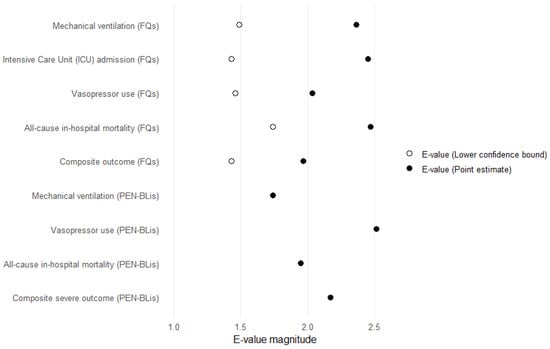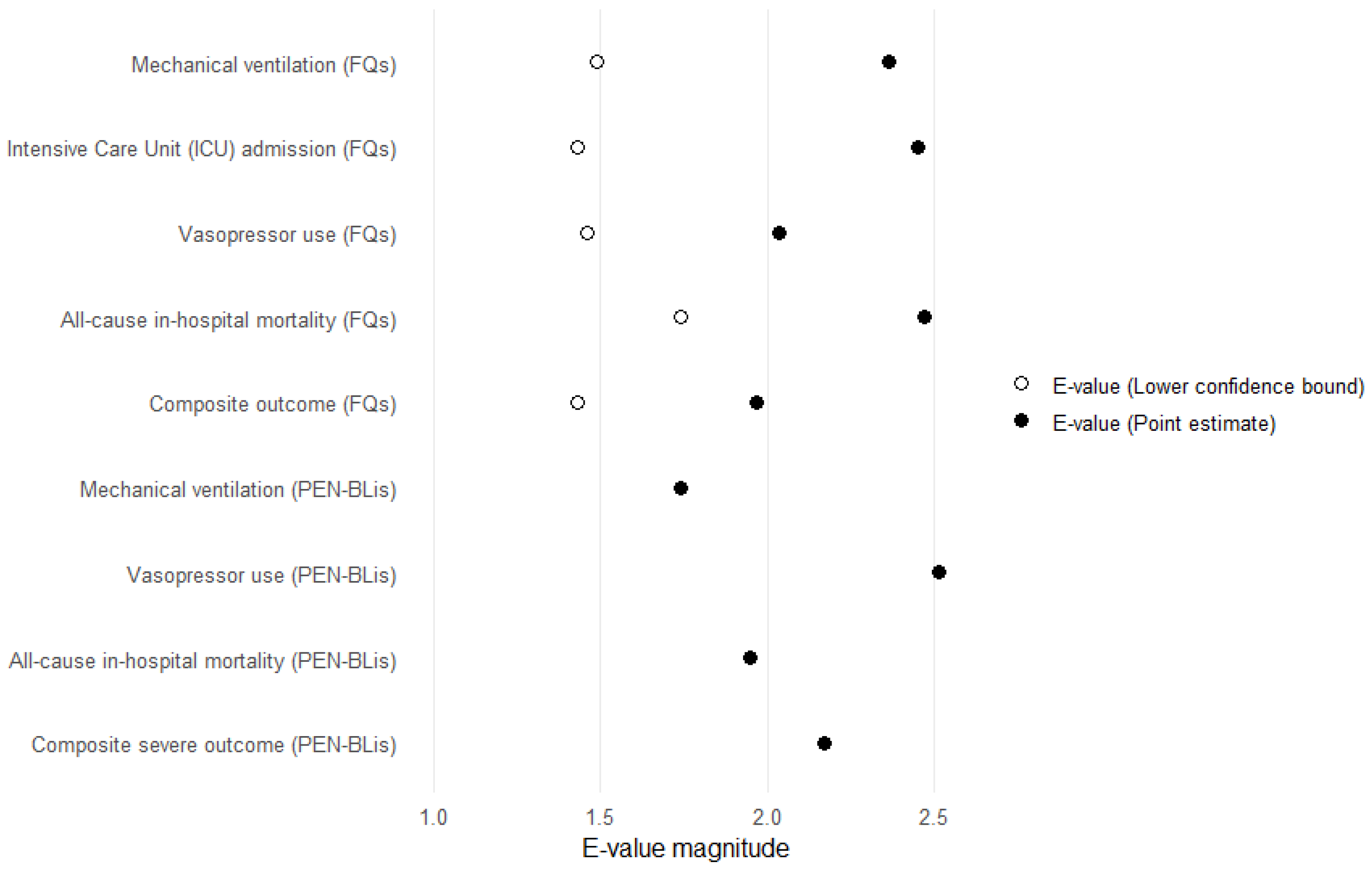 To evaluate the robustness of our effect estimates to potential unmeasured confounding, a quantitative bias analysis was performed by calculating E-values. The E-value quantifies the minimal strength of association, on the risk-ratio scale, that an unmeasured confounder would need with the exposure and outcome, beyond the measured covariates, to fully explain the observed association [