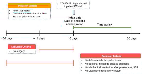 To mitigate confounding from prior infections, prophylactic antibiotic use, or advanced illness, individuals were excluded if they had received systemic antibiotics, been diagnosed with a bacterial infection or respiratory disorder, required mechanical ventilation or vasopressors, or had ICU admission within 30 days before the index date. Patients who underwent surgery within 14 days before the index date were also excluded.