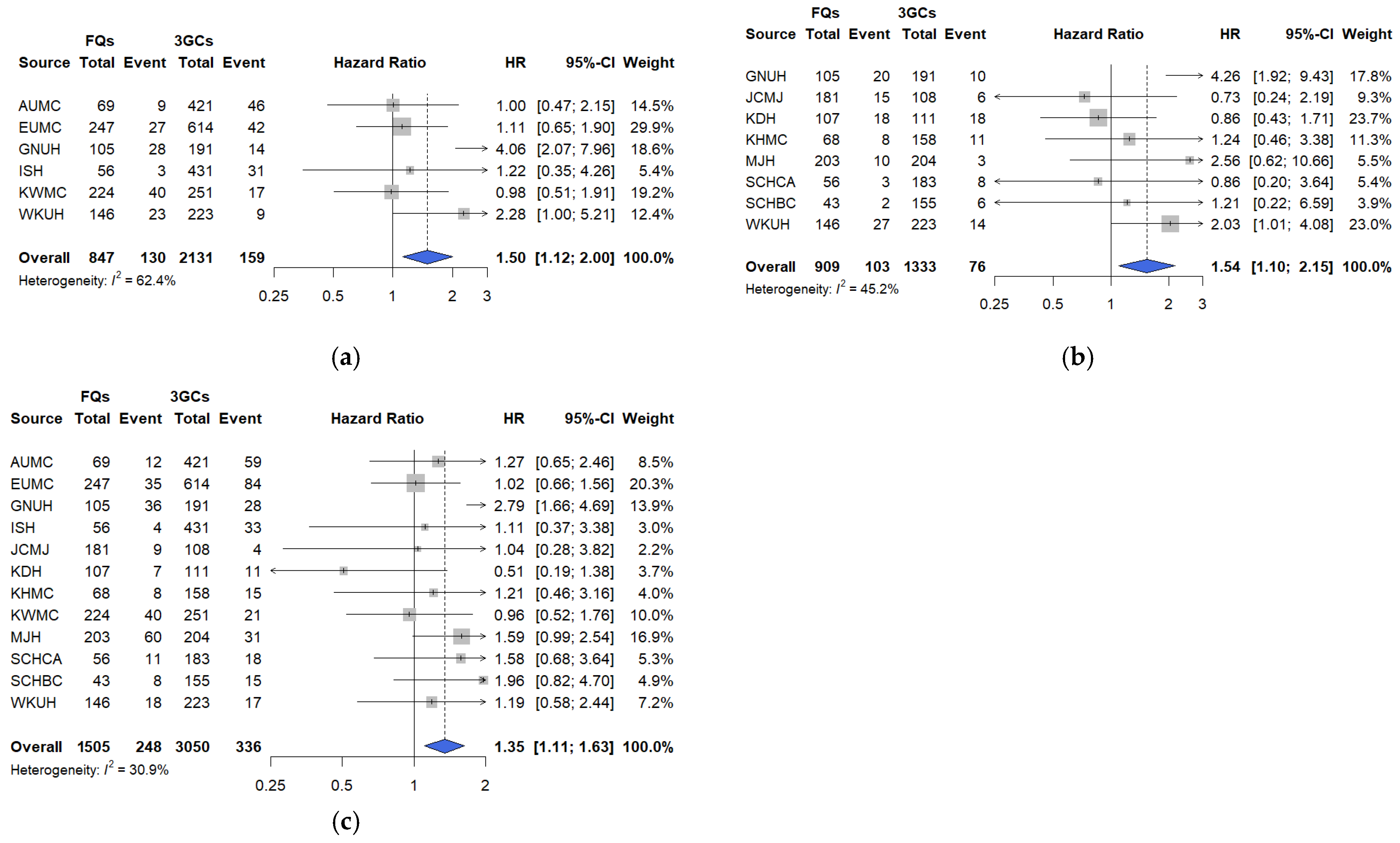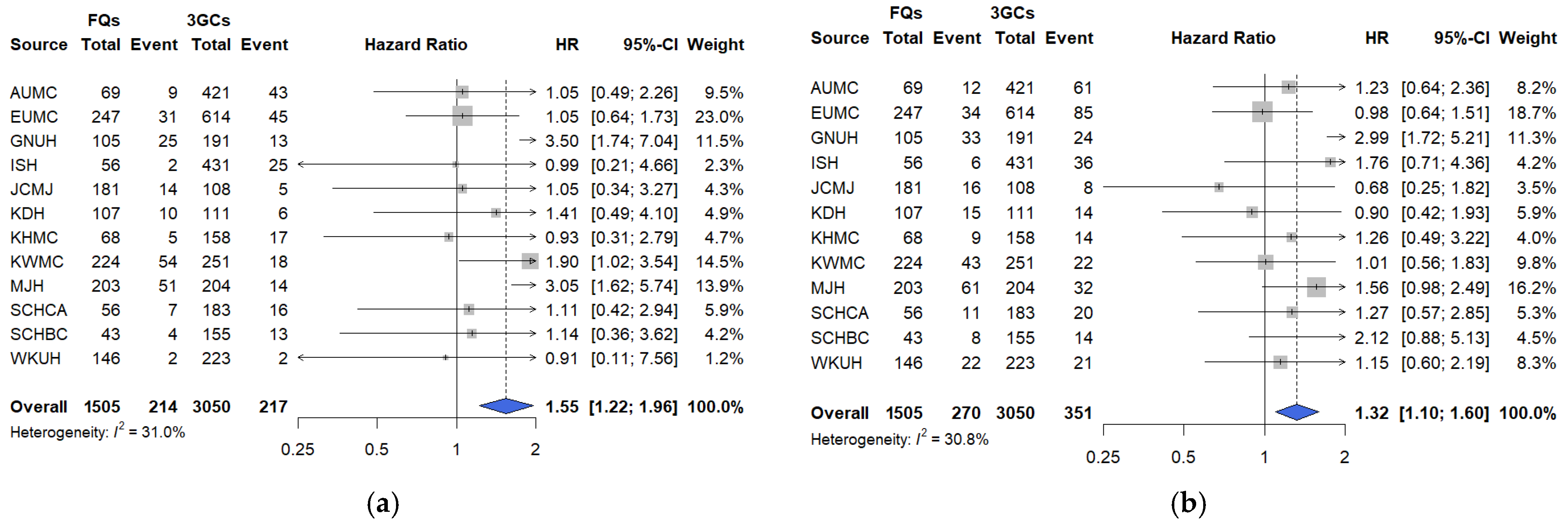 28]. Collectively, these mechanistic considerations provide a biologically plausible framework for understanding that fluoroquinolone use, compared with 3GCs, is associated with higher risks of mechanical ventilation, ICU admission, vasopressor use, in-hospital mortality, and the composite endpoint. Accordingly, preventive monitoring and risk mitigation strategies are warranted when fluoroquinolones are indicated.