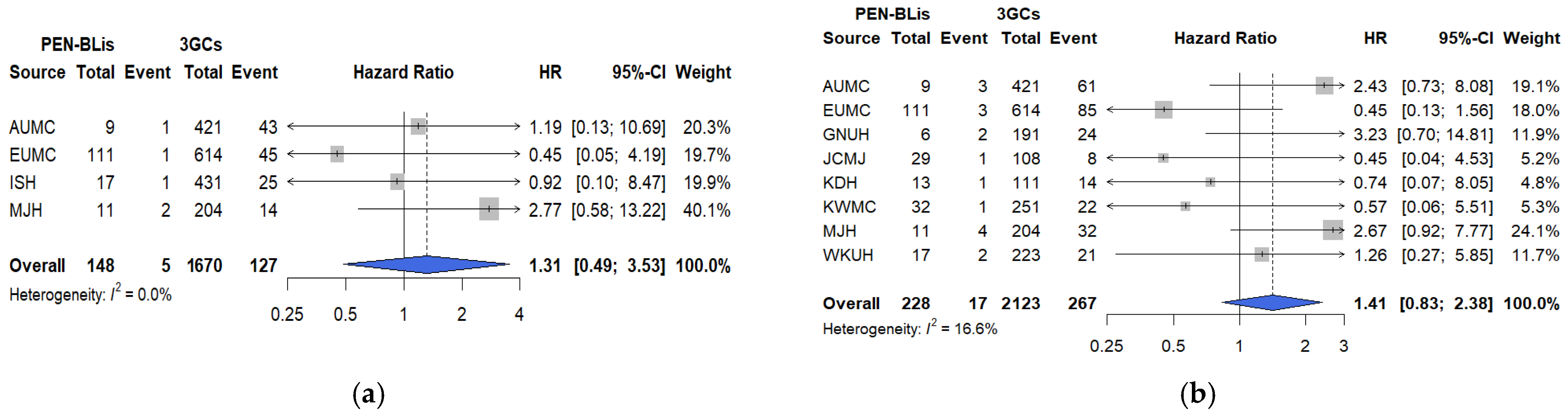 For PEN–BLis, although the association was not statistically significant, likely owing to smaller sample sizes and lower event rates, the consistent direction of point estimates across outcomes suggests a potential safety signal that warrants further investigation in larger cohorts. Similar findings were reported in a previous study of community-acquired pneumonia, revealing higher in-hospital mortality and