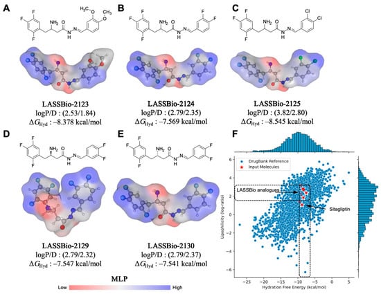 Molecular lipophilicity potential (MLP) surface map of compounds (A) LASSBio-2123, (B) LASSBio-2124, (C) LASSBio-2125, (D) LASSBio-2129, and (E) LASSBio-2130, and (F) AI-based data similarity test for estimation of lipophilicity at physiological pH (logD) and hydration free energy (∆GHyd).