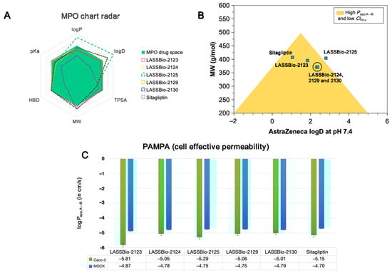 (A) Radar plot of multiparameter optimization (MPO) criteria, (B) alignment between logD at pH 7.4 and MW for estimation of effective cell permeability profile (Papp,A→B) and intrinsic hepatic clearance (Clint,u), and (C) prediction of cell effective permeability (PAMPA) for the compounds LASSBio-2123, LASSBio-2124, LASSBio-2125, LASSBio-2129, LASSBio-2130, and the reference drug, sitagliptin.