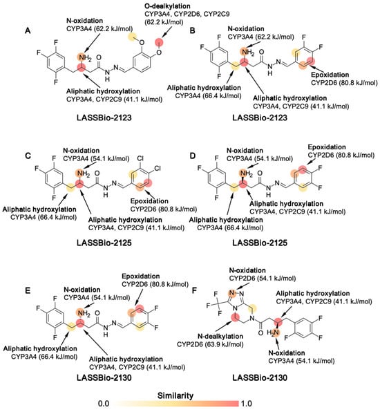 Site of metabolism prediction for compounds (A) LASSBio-2123, (B) LASSBio-2124, (C) LASSBio-2125, (D) LASSBio-2129, (E) LASSBio-2130, and (F) Sitagliptin. The 2D susceptibility map was plotted using the SMARTCyp 3.0 server, where the test identifies the structural sensitivity of a fragment to be a substrate of CYP3A4, CYP2C9, or CYP2D6 based on the degree of specificity of the molecular fragment, resulting in a similarity score ranging from 0.0 (low metabolism) to 1.0 (high metabolism) and stating the relative activation energy for biotransformation to occur.
