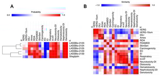 (A) prediction of organic toxicity descriptors expressed in probability (on a scale from 0.0 to 1.0) and (B) Pearson correlation for analysis of data similarity between toxicity descriptors.