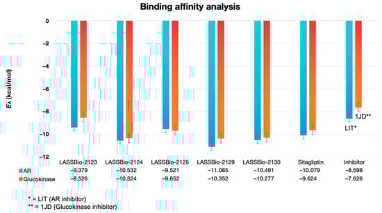 Affinity energy (EA) values obtained at the end of molecular docking simulations between the ligands LASSBio-2123, LASSBio-2124, LASSBio-2125, LASSBio-2129 and LASSBio-2130 and the enzymes aldose reductase (blue bar) and glucokinase (orange bar).