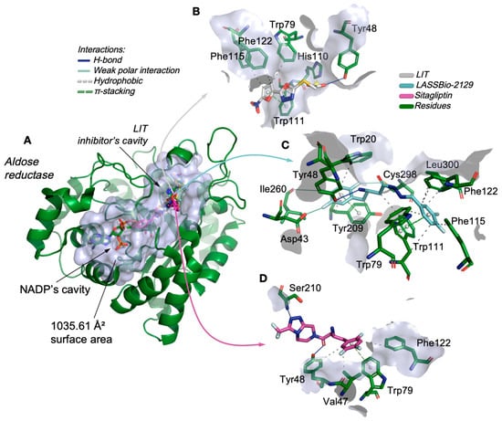 (A) Three-dimensional representation of the docking of the ligands LASSBio-2123, LASSBio-2124, LASSBio-2125, LASSBio-2129 and LASSBio-2130 in the catalytic site of aldose reductase, and analysis of the ligand–protein interactions of the ligands. (B) LIT (aldose reductase inhibitor), (C) LASSBio-2129, and (D) sitagliptin.