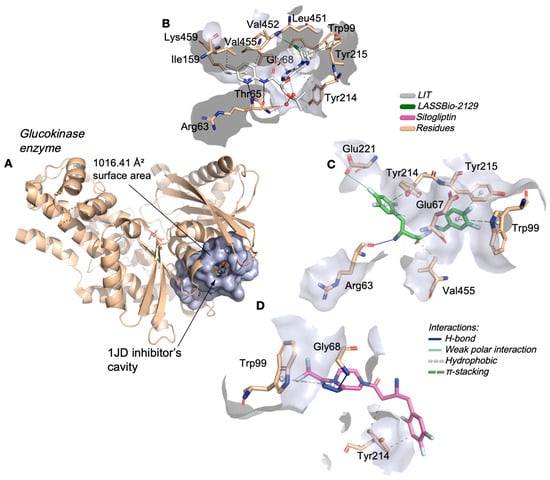 (A) Three-dimensional representation of the docking of the ligands LASSBio-2123, LASSBio-2124, LASSBio-2125, LASSBio-2129 and LASSBio-2130 in the catalytic site of glucokinase, and analysis of the ligand–protein interactions of the ligands. (B) 1JD (glucokinase inhibitor), (C) LASSBio-2129, and (D) sitagliptin.