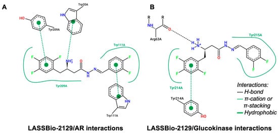 In an analysis of structural contributions, it was possible to observe that LASSBio-2129 interacted similarly with both aldose reductase and glucokinase (Figure 8). The fluoro-substituted aromatic substructures of the compound contributed strongly to the formation of hydrophobic interactions with the aromatic portions of the Tyr209 and Trp111 residues (Figure 8A), and to the formation of interactions of the same nature with the aromatic residues of Tyr214 and Tyr215 of the glucokinase enzyme (Figure 8B). On the other hand, the primary amine of the compound (R-NH3+ at pH 7.4) favored the formation of a π-cation nature with the aromatic portion of the Trp20 residue in the aldose reductase enzyme (Figure 8A), while it favored the formation of a polar H-bond donation to the carbonyl portion of Arg63 of the glucokinase enzyme (Figure 8B).