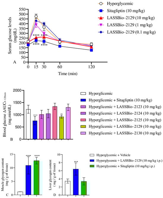 Dose–response curve of LASSBio-2129 and Sitagliptin 10 gm/kg i.p. on GTT (A) and AUC0–120min for GTT was calculated from the average data of seven mice for each point (B). Glycogen content of mice that received the compound LASSBio-2129 administered via i.p. on GTT on skeletal muscle (C) and liver (D). Values are expressed as mean ± S.E.M.; n = 7. **** p ≤ 0.0001, *** p ≤ 0.001 and ** p ≤ 0.01 compared to the hyperglycemic group (2 g/kg).