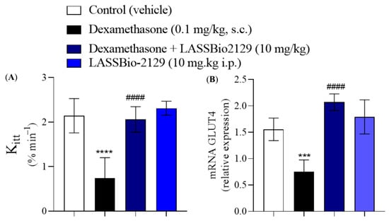 Dexamethasone-induced insulin resistance is a good model for assessing insulin resistance in skeletal muscle and adipose tissue [25,26,27]. The control group (saline) presents normal glucose metabolism function, indicating normal insulin sensitivity, with rapid glucose absorption by the tissues. In the dexamethasone group, there was a reduction of approximately 58% in insulin sensitivity compared to the control group, indicating a lower efficiency in glucose uptake in response to insulin (Figure 10A). Treatment with LASSBio-2129 (10 mg/kg, i.p.) increased insulin sensitivity by approximately 127% compared to the dexamethasone group. When LASSBio-2129 was administered to healthy animals, there was no increase in insulin sensitivity compared to the control group (saline), and adverse or toxic effects were not observed during the five days of administration of this compound. Treatment with LASSBio-2129 (10 mg/kg i.p.) increased GLUT4 transporter expression in muscle by 2.77-fold, when compared to the dexamethasone group. LASSBio-2129 in healthy animals did not increase GLUT4 expression when compared to the control group (saline) (Figure 10B).