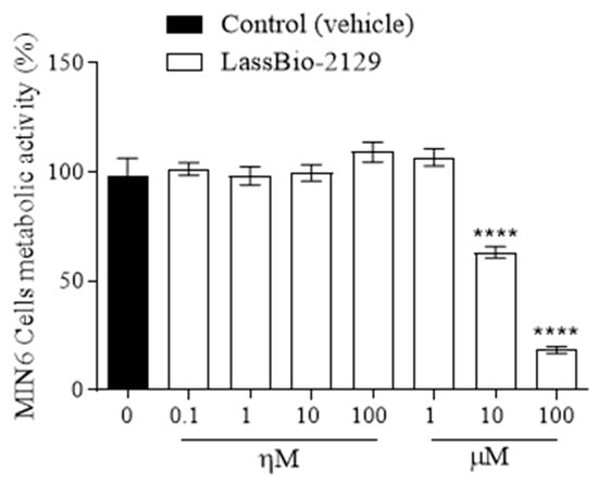 Cell viability of MIN6 cells treated with different concentrations of LASSBio-2129. Values are expressed as mean ± S.E.M. from five independent experiments performed in triplicate. **** p ≤ 0.0001 compared to the control group.