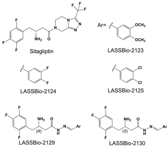 Chemical structures of sitagliptin and LASSBio-2123, 2124, 2125, 2129, 2130 analogs developed as potential DPP-4 inhibitors (adapted from [5]).