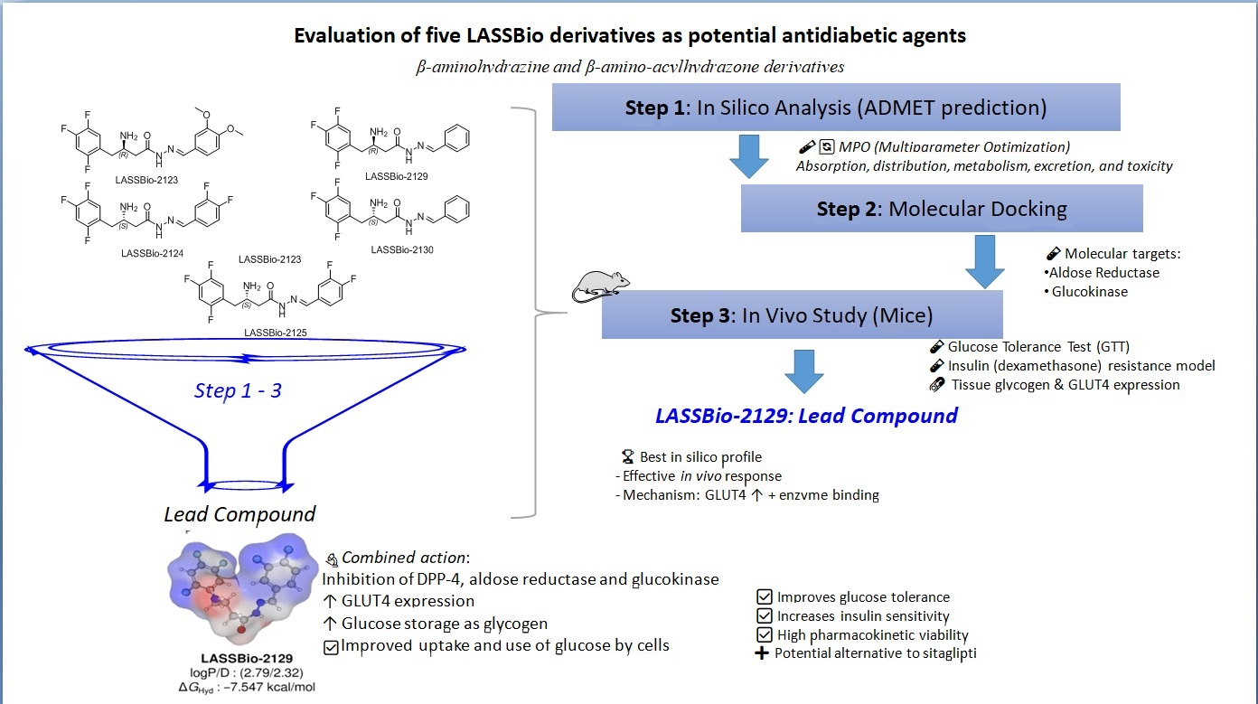 MPO-based ADMET estimates classified LASSBio-2129 as a leading compound due to its low lipophilicity at physiological pH and alignment between high cell permeability and metabolic stability in liver microsomes, although it is estimated to be a pharmacological active principle based on the control of the daily oral dose administered. Molecular docking simulations showed that the analogs can bind to the catalytic site of both aldose reductase and glucokinase in the treatment of T2DM, with emphasis on LASSBio-2129 due to its low affinity energy and high pharmacokinetic viability. The effects of LASSBio-2129 (10 mg/kg) on a glucose tolerance test and insulin sensitivity on insulin resistance were partially mediated by increased GLUT 4 expression in muscle tissues. Still, LASSBio-2129 was safe up to 10 µM in the cell viability test in MIN6. The data set obtained shows that LASSBio-2129 may have similar effects to sitagliptin on glucose metabolism and possibly fewer adverse effects, it a promising molecule for the treatment of diabetes.