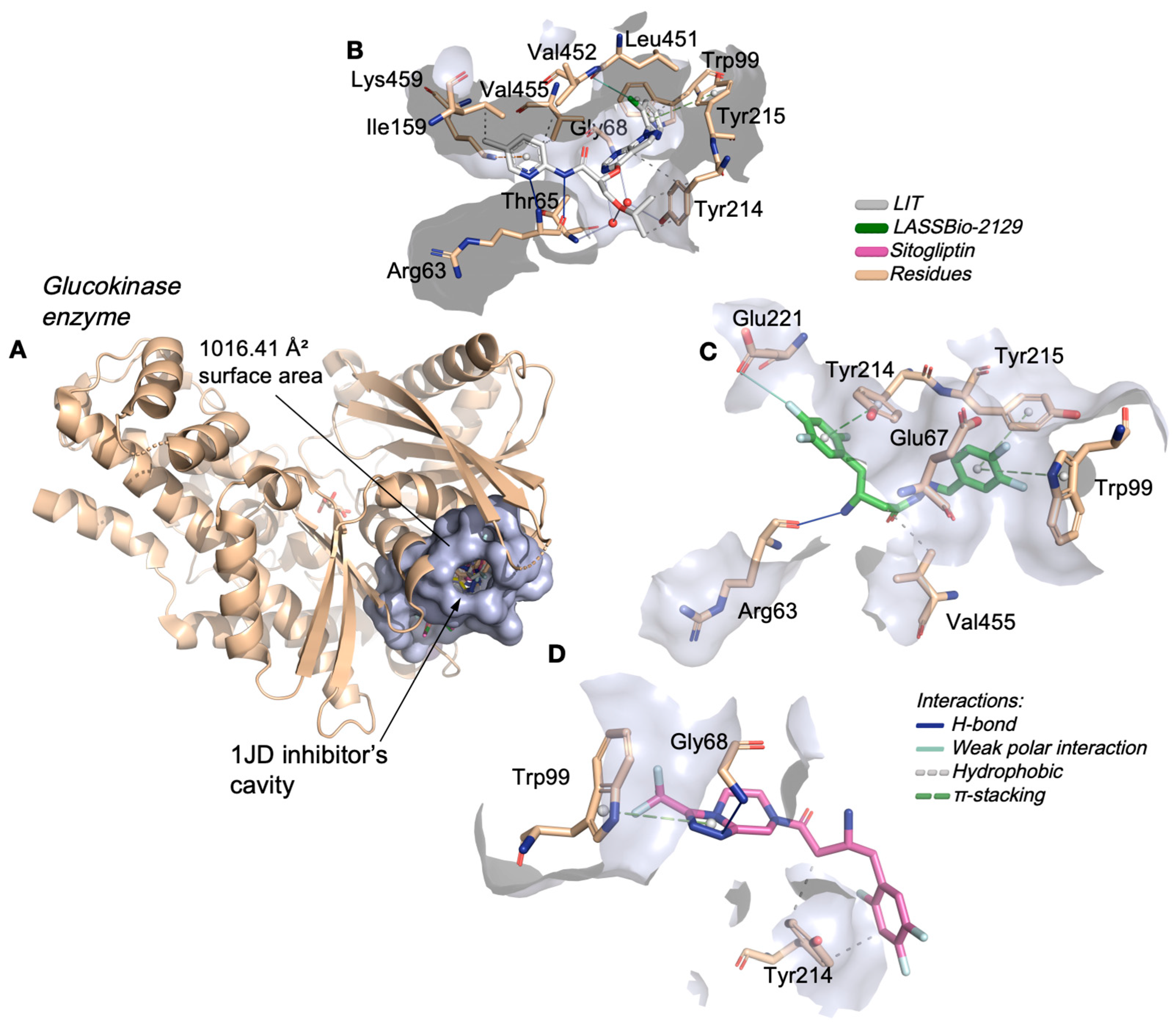 Glucokinase | LASSBio-2123 | 1.238 | Hydrophobic | Thr65 (3.93), Tyr215 (4.00), Glu221 (3.78), Val455 (3.43) |