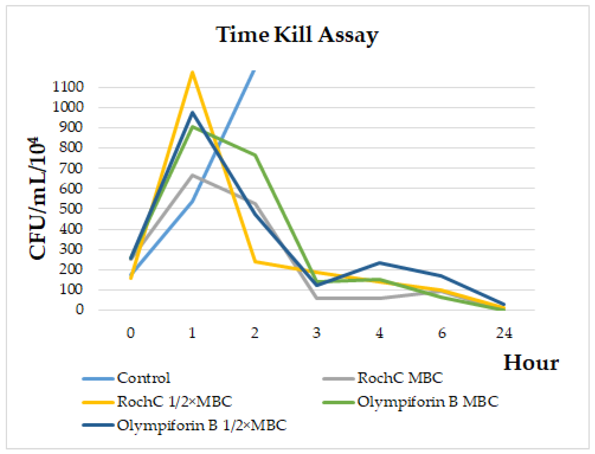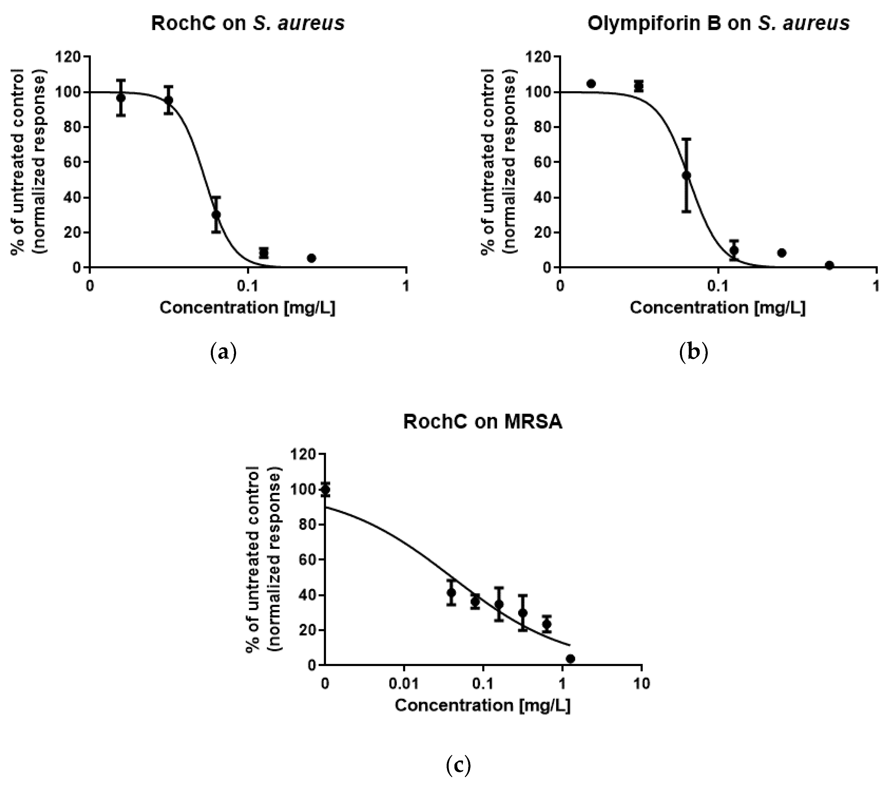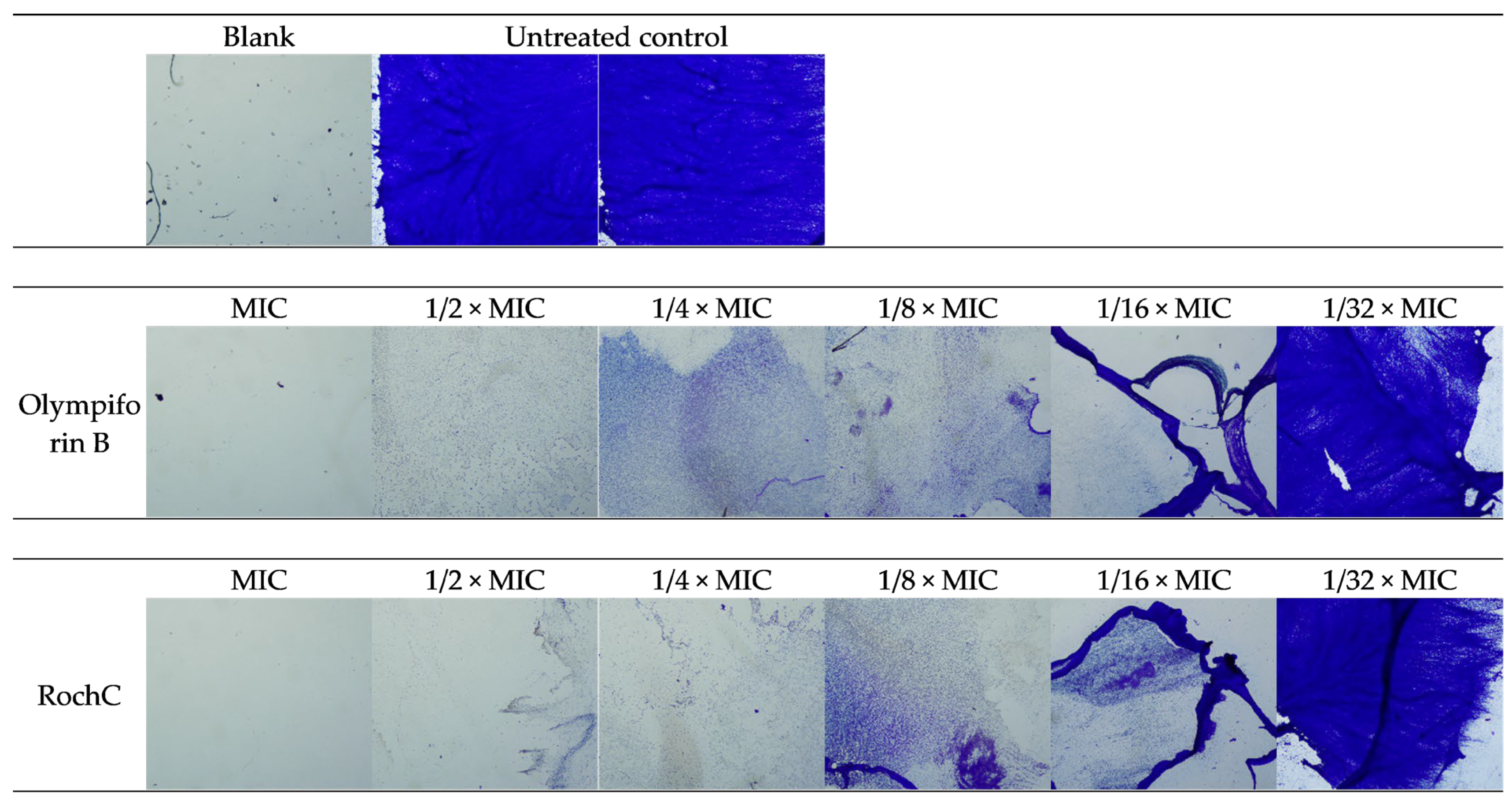 116]. However, cytotoxic agents may not directly kill cells but inhibit their division and multiplication, i.e., be cytostatic. In the current study, not only RochC and olympiforin B in the low MIC doses, but the undoubtedly cytotoxic doses of 2 × IC