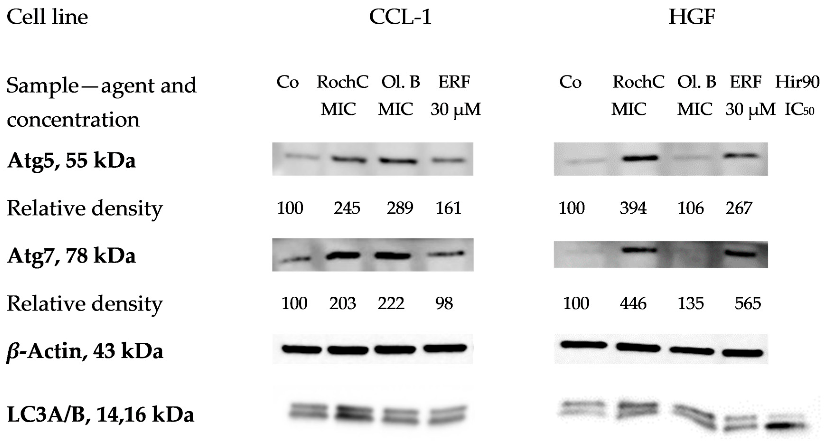 The results of this study showed that Atg5 and Atg7 were induced significantly in most samples, indicating the activation of autophagy, while LC3A/B was converted to the lower migrating form visibly—also an indicator of autophagy—only in the positive control (30 µM erufosine) and the HirDM90 IC50 treatment. Further experiments may include antibodies for other proteins from the autophagic cascade, such as Beclin-1, Atg3, Atg16L1, etc.