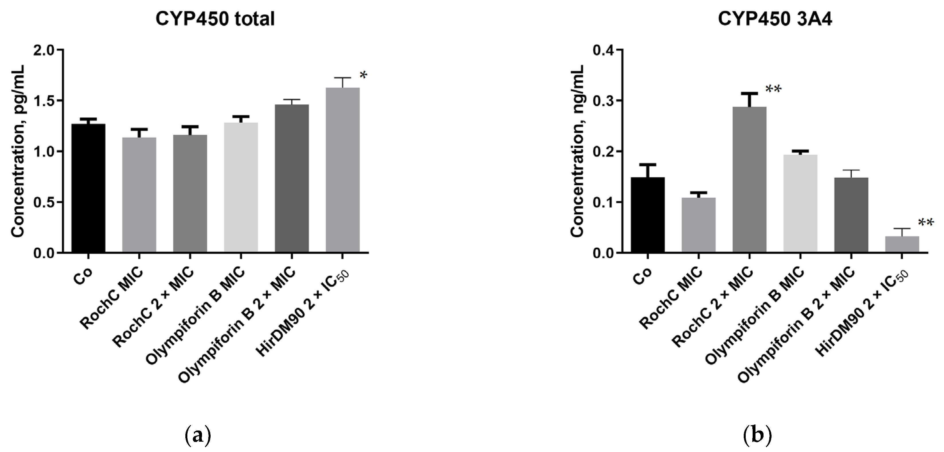 S. aureus, they hardly induce total CYP450 and its main isoform 3A4. The only exception was the dose of 2 × MIC of RochC, which induced CYP450 3A4, and this has to be taken into account for possible future application.