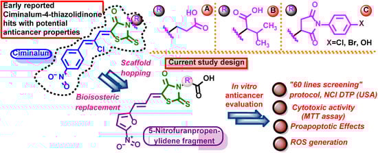 Considering the antitumor potential of the described hybrids and the possibilities of applying scaffold hopping and bioisosteric replacement methodologies, in the present paper, we report a synthesis of 4-thiazolidinone hybrids with a 5-nitrofuranpropenylidene moiety and an evaluation of their anticancer properties.