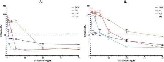 Dose–response curves representing the results of the MTT assay for the cytotoxicity of cancer cells of the most active compounds 2b, 12b, and 14b. (A) MCF-7 line (B) MDA-MB-231 line. The dotted line represents the value of 50% cell inhibition in relation to the concentration of the tested compounds. The number of repetitions for each compound and for each line is 3.