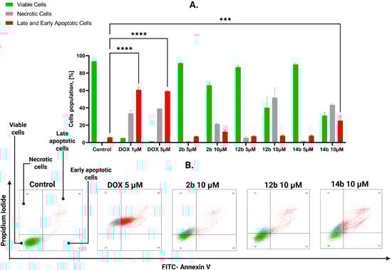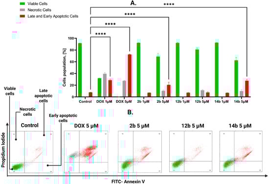Results of flow cytometry analysis on MCF-7 cell line after 24 h of incubation with tested compounds 2b, 12b, 14b and the reference drug doxorubicin in concentrations 1 and 5 μM. (A) The graph shows the obtained results and compares late apoptotic cells after treatment to the viable cells. Means ± SD are shown with N = 2. ANOVA test **** p ≤ 0.0001. (B) The graph visualizes the cytograms obtained from flow cytometry analysis. The number of repetitions for each compound and for each line is 3.