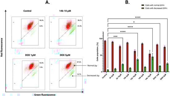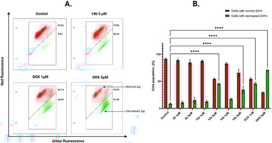 Results of flow cytometry measurement (A) of changes in the mitochondrial membrane potential (ΔΨm) of MDA-MB-231 breast cancer cells after 24 h of incubation with tested compounds in concentrations 5 and 10 μM and DOX (1 and 5 μM). The graph (B) visualizes the cytograms from the analysis of compounds. Means ± SD are shown with N = 2. ANOVA tests were used to demonstrate differences between cells treated with compounds. * p ≤ 0.5; *** p ≤ 0.001; **** p ≤ 0.0001. The number of repetitions for each compound and for each line is 3.