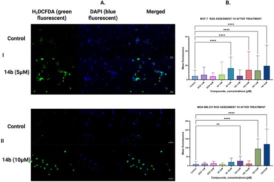The influences of 2b, 12b, 14b, and doxorubicin (1 and 5 µM and 5 and 10 µM for MCF-7 and MDA-MB-231 cell lines, respectively) on the generation of reactive oxygen species (ROS) were analyzed. Cells were seeded in 6-well culture plates at 1 × 105 cells per well in 1 mL of medium and then treated with compounds for 1 h and then washed with PBS. Double staining was conducted with 20 µM 2′,7′-dichlorodihydrofluorescein diacetate (H2DCFDA) reagent (Thermo Fisher Scientific, Eugene, OR, USA), which is colorless, and is cleaved by intracellular esterases and oxidized to the highly fluorescent 2′,7′-dichlorofluorescein (DCF), and 10 µg/mL of the fluorescent dye 4′,6-diamidino-2-phenylindole (DAPI) (Sigma-Aldrich, St. Louis, MO, USA), which visualizes the nuclear DNA of cells. A Nikon ECLIPSE Ti fluorescence microscope (Nikon, Tokyo, Japan) was used to obtain results which were analyzed using ImageJ software 1.54k (Bethesda, MD, USA). The fluorescence intensity of the DCF reagent was evaluated relative to the control. The number of analyzed cells was above 100.