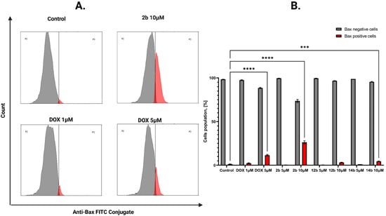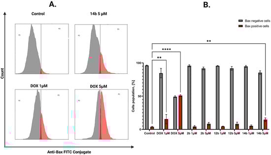 The effect of the tested compounds on the intrinsic mitochondrial pathway of programmed cell death was further assessed. For this purpose, the concentration of the proapoptotic Bax protein from the Bcl-2 family was examined [32]. The concentration of this protein was analyzed in breast cancer cells after treatment with novel compounds at concentrations of 1 and 5 µM for the MCF-7 line and 5 and 10 µM for the MDA-MB-231 line. The most significant result on the MCF-7 cell line was obtained for the 14b compound in 5 µM concentration, where the Bax-positive cell population was 14.67%, while in the MDA-MB-231 cell line the most notable result was displayed by compound 2b with 26.33% of cells in the Bax-positive population (Figure 8 and Figure 9).