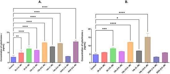 Results of ELISA method of concentration of cytochrome C in MCF-7 (A) and MDA-MB-231 (B) breast cancer cells after 24 h of incubation with compounds 2b, 12b, 14b in concentrations 1 and 5 μM for MCF-7 cell line and 5 and 10 μM for MDA-MB-231 cell line. Doxorubicin’s concentrations for both lines were 1 and 5 μM. Means ± SD are shown with N = 3. ANOVA tests were used to demonstrate differences between cells treated with compounds. * p ≤ 0.5; ** p ≤ 0.01; *** p ≤ 0.001; **** p ≤ 0.0001. The number of repetitions for each compound and for each line is 3.