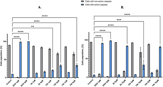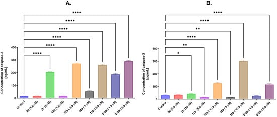 ELISA results of caspase-3 assessment in MCF-7 (A) and MDA-MB-231 (B) breast cancer cells after 24 h of incubation with compounds 2b, 12b, 14b in concentrations 1 and 5 μM for MCF-7 cell line and 5 and 10 μM for MDA-MB-231 cell line. Doxorubicin’s concentrations for both lines were 1 and 5 μM. Means ± SD are shown with N = 3. ANOVA tests were performed to demonstrate statistical differences between cells treated with compounds. * p ≤ 0.5; ** p ≤ 0.01; **** p ≤ 0.0001. The number of repetitions for each compound and for each line is 3.