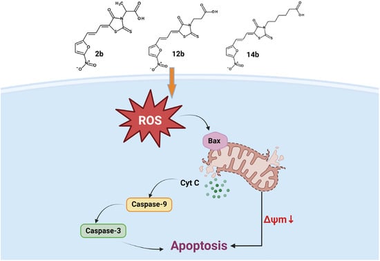Based on the results obtained in biological tests, we noted the impact of compounds on the two most important structures in the cell genetic material and mitochondria (Figure 13). The damaging effect on mitochondria by tested compounds can be attributed to the increased generation of reactive oxygen species. This starts a cascade of activations of numerous proapoptotic factors, such as increase in Bax protein expression, decrease in mitochondrial potential, release of cytochrome C, and increased caspases-9 and -3 concentrations in cancer cells [40]. Increasing the concentration of Bax protein causes permeabilization of the mitochondrial membrane [41]. It reduces mitochondrial potential, which disrupts the synthesis of ATP, the main energy carrier in the cell, which addresses the cell into the apoptotic pathway [42]. Due to the damaged mitochondrial membrane, cytochrome C is released into the cytosol. This protein is located in the intermembrane space of the mitochondria, playing a role as an electron transporter in the respiratory chain. However, it also serves as a signal along the intrinsic pathway of apoptosis. As such, released cytochrome C leads to the activation of initiator caspase-9, which, in turn, causes the activation of effector caspase-3. This protein is a final step in the intrinsic pathway of apoptosis and the one that ultimately leads the cell to the process of programmed cell death [43].