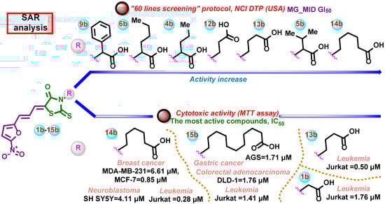 Based on the anticancer activity screening results, some preliminary structure–activity relationships for the synthesized 5-((5-nitrofuran-2-yl)allylidene)-2-thioxo-4-thiazolidinones have been possible to conclude (Figure 14).